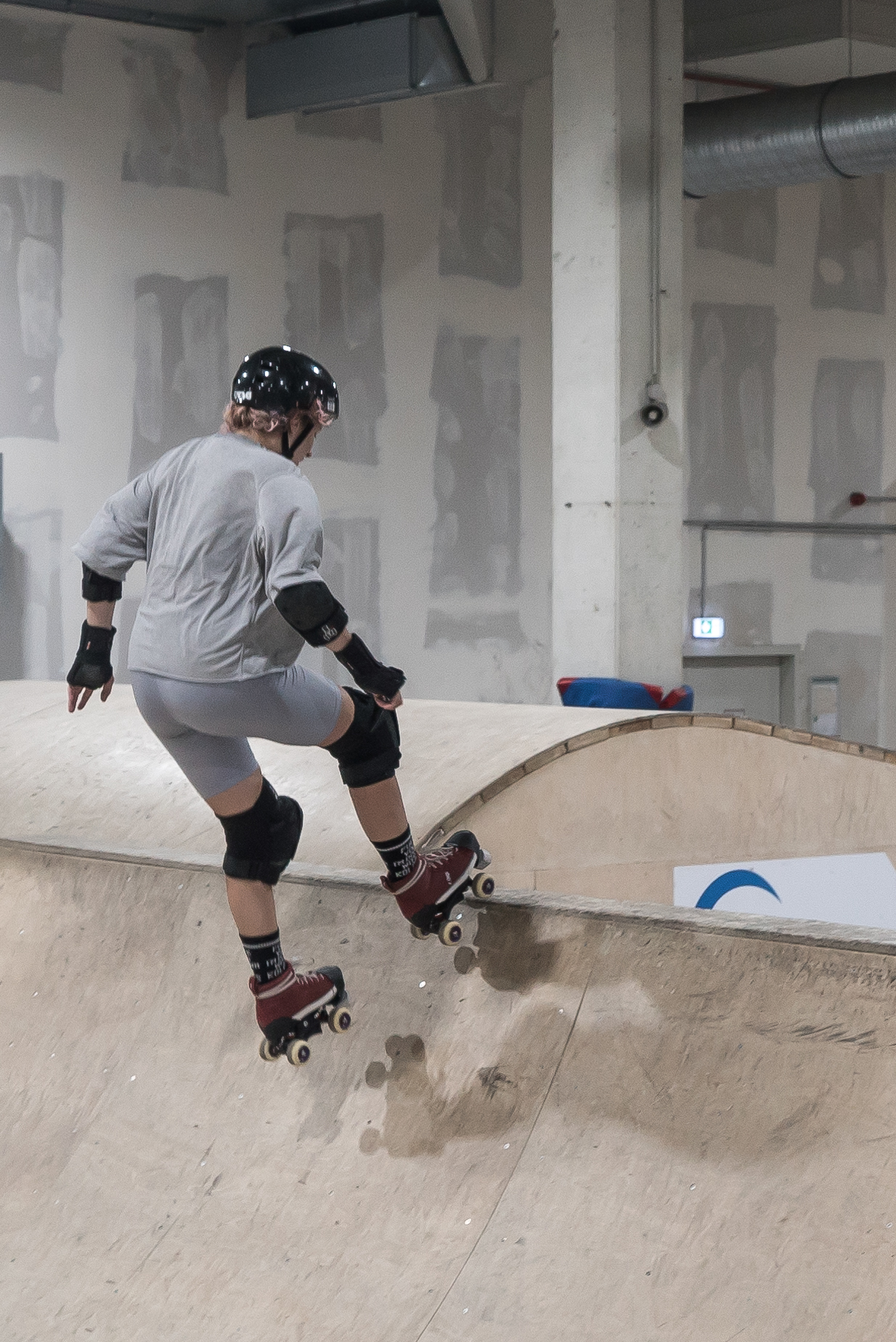 Wie wichtig dieser geschützte Raum ist, weiß auch Teilnehmerin Dalia, die bereits mit elf Jahren auf dem Skateboard in einer Weyher Halfpipe fuhr, heute mit Rollschuhen jedoch wieder Anfänger:innen-Erfahrungen sammelt. ›Ich fahr nicht immer, weil ich noch nicht so gut fahre und mir das zu hektisch ist‹, sagt sie. Beim Montagsangebot ist immer viel Support, eine ›entspannte Atmosphäre‹ und ›auffällig, dass jeder Rücksicht nimmt‹. Auch der Holzboden auf den Rampen sei hilfreich, im Vergleich zum harten Beton in der Überseestadt oder am Schlachthof. Sie selbst engagiert sich ehrenamtlich für Skateprojekte in Bremen und im Irak, die sich für marginalisierte Gruppen einsetzen.