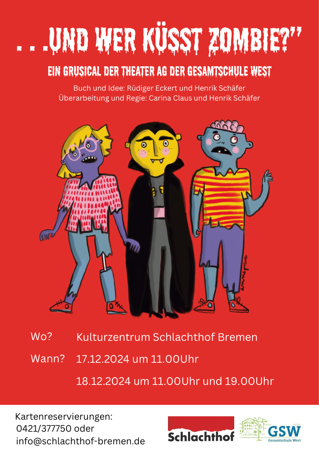„,…und wer küsst Zombie?“ hatte vor 29 Jahren Premiere und war so erfolgreich, dass die Theater-AG der GSW damit einen bundesweiten Theaterpreis gewonnen hat. Dieses Stück, geschrieben von Rüdiger Eckert und Henrik Schäfer, wurde nun unter der bewährten Regie von Carina Claus und Henrik Schäfer kräftig überarbeitet und kommt nun kurz vor Weihnachten wieder auf die Bühne. Neben aktuellen Schülerinnen der GSW spielen auch ehemalige Theater-AGler, Lehrer:innen und Eltern mit..