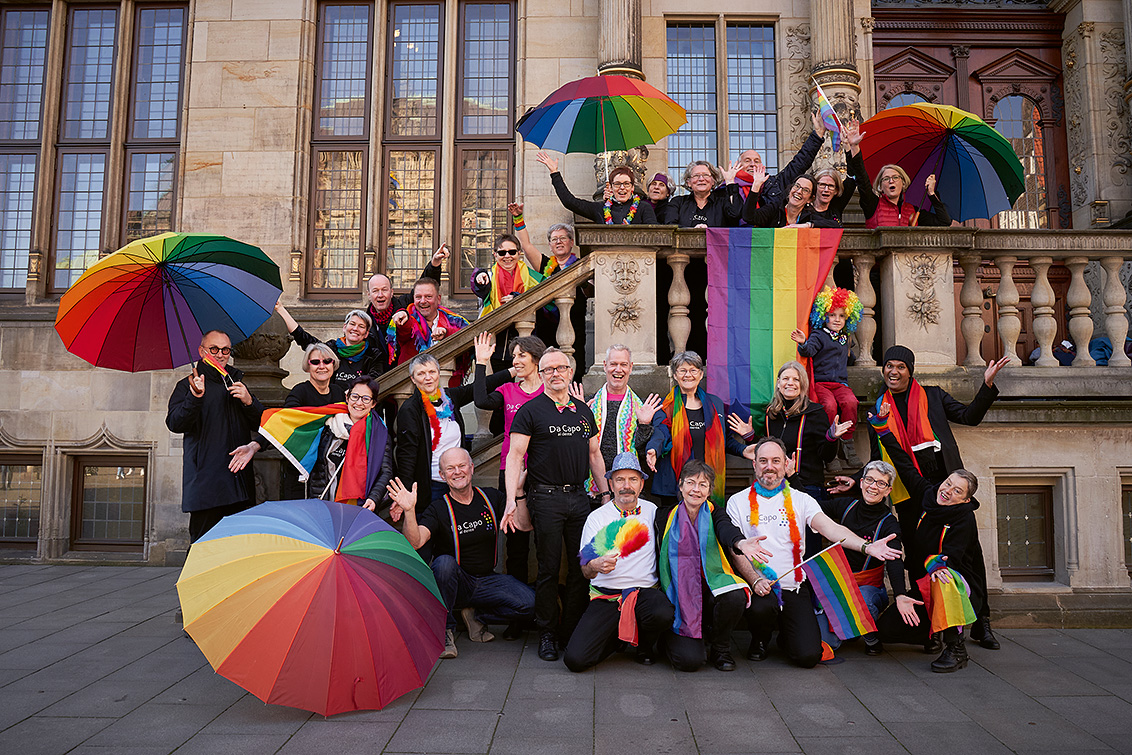 Musikalisch und harmonisch klingt es beim queeren Bremer Chor Da Capo al dente, wenn aktuell circa 30 Sänger:innen donnerstags unter der Leitung von Washington de Oliveira im Viertel proben oder ihr Können auf der Showbühne präsentieren. Das Repertoire geht dabei ›ziemlich quer durch den Garten‹, sagt Ulrike, die seit 2002 im Alt dabei ist. Aktuell überwiegend Pop, es werden jedoch auch anlassbezogene Stücke wie Weihnachtslieder, Traditionals oder klassische Stücke aus Romantik oder Barock einstudiert. Besonderes Highlight sind neben den Chorwochenenden die gemeinsamen Fahrten zu queeren Chorfestivals. ›Du badest in Musik‹, schwärmt Ulrike von den circa hundert queeren Chören, die 2023 bei ›Various Voices‹ in Bologna dabei waren. ›Was ich immer toll finde, wenn die Chöre aus Ländern kommen, in denen es alles andere als leicht ist, queer zu leben. Ich bin beeindruckt von dem Mut.‹ Interessierte werden zu Schnupperterminen eingeladen. Willkommen sind alle, wie bei vielen gemischten Chören mangelt es insbesondere an den tieferen Tenor- und Bassstimmen. ›Da freuen wir uns sehr, wenn Verstärkung dazu kommt‹, so Ulrike.