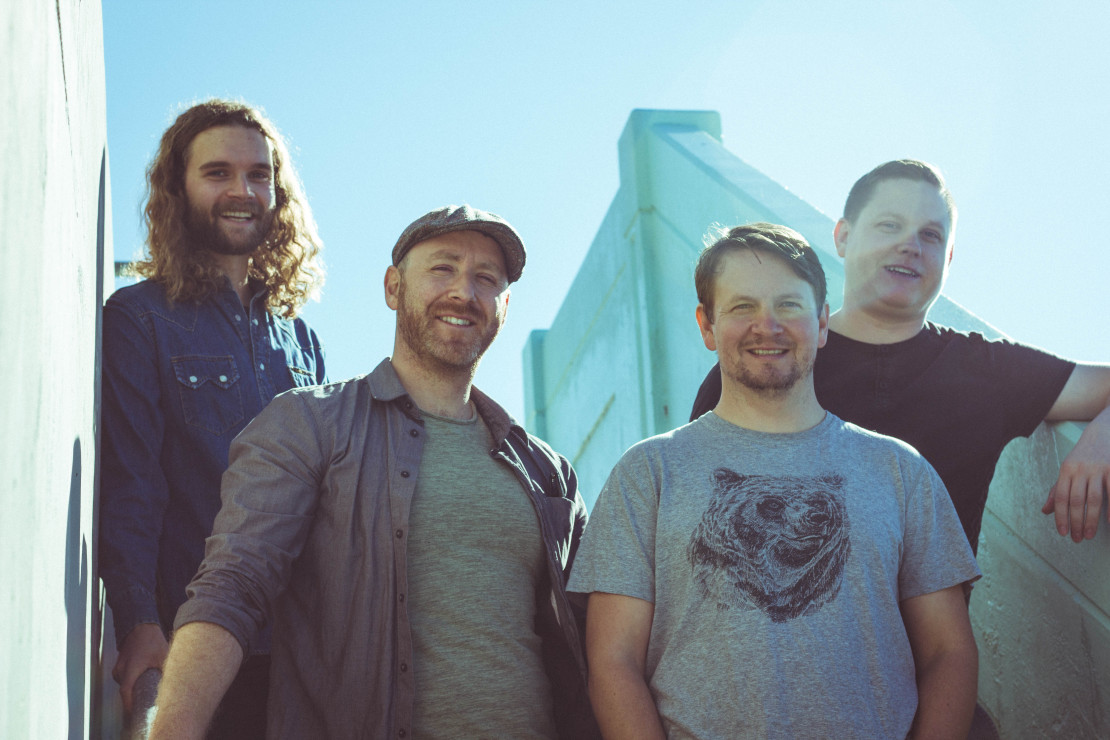 Vier männlich gelesene Menschen die lächeln. Bandmitglieder Jon And Roy