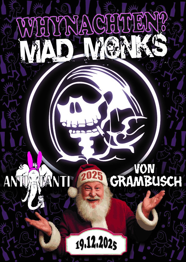 WHYNACHTEN? Dafür gibt es mindestens 3 gute Gründe. Der Erste heißt ANTIFANTI. Laut und brachial verschmelzen Punkrock und Metal zu einer Kampfansage gegen Faschismus und patriarchales Mackertum. Der zweite Grund heißt VON GRAMBUSCH. Akustik-Pop-Punk, der sich mit Humor und Ironie zärtlich in Deine Seele spült. Und der dritte Grund sind die gastgebenden MAD MONKS, die wieder einmal traditionsgetreu zum Skapunk-Tanze laden und ihr Repertoire an diesem Abend auch wieder mit selten gesäten Hits auffüllen. Wer Weihnachten liebt, sollte unbedingt dabei sein. Und wer nicht, erst recht.